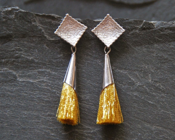 Silver post earrings with gold tassels, Textured earrings, Tassel Jewelry, Boho Chic Earrings, Bohemian jewelry, Gift for women, 1142-10 by StudioDjewelry